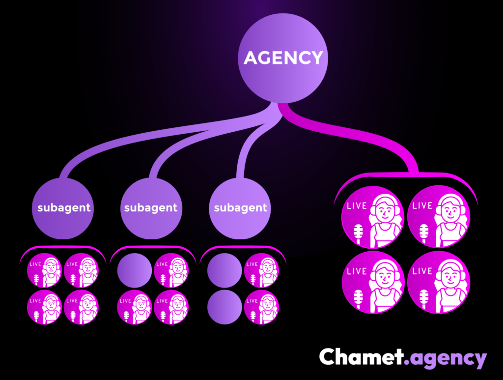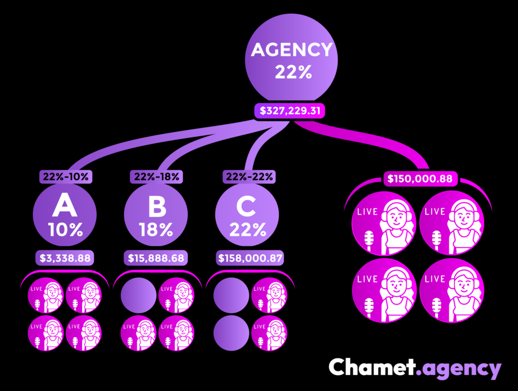 O sistema de comissões da Chamet Agency determina como os agentes ganham renda com base no desempenho de sua equipe. Os agentes recebem comissão com base na receita gerada tanto pelas anfitriãs diretas quanto pelos subagentes dentro de sua rede de agência.