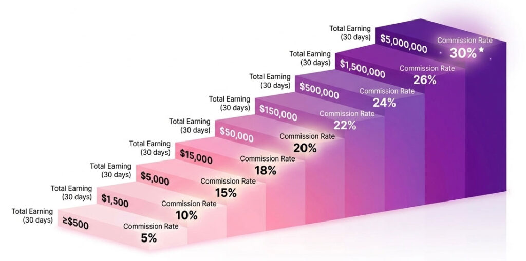 O sistema recalcula a taxa de comissão diariamente com base no período de desempenho mais recente de 30 dias.